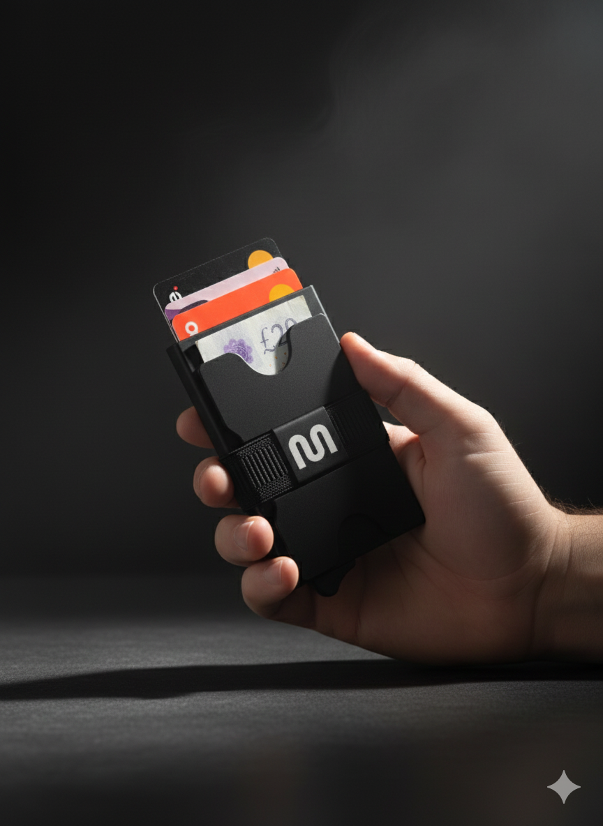 Designed in the UK. Holds your essential cards securely in a slim aluminium body — with one-handed access.